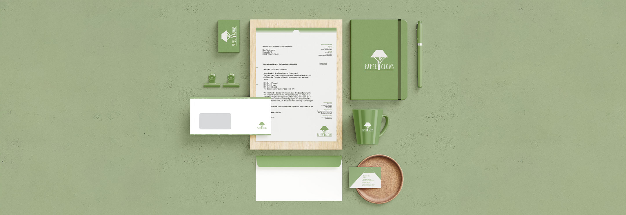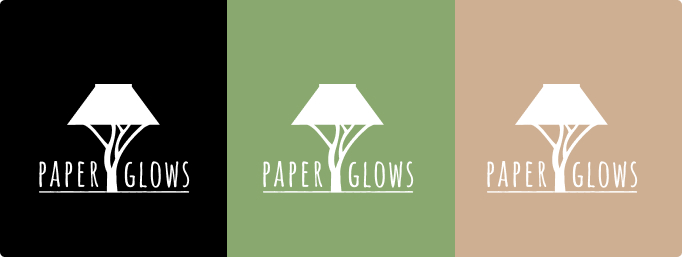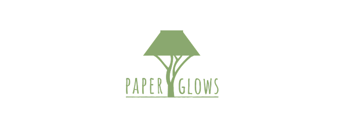 The logo combines a minimal lamp shape with the name Paperglows set in Amatic SC. It was built using a custom grid. The mark appears in green or white depending on background and can be used on black, green, or brown surfaces. A protection zone and minimum size were defined. The claim “Bau dir eine.” when used, is always placed underneath the logo.