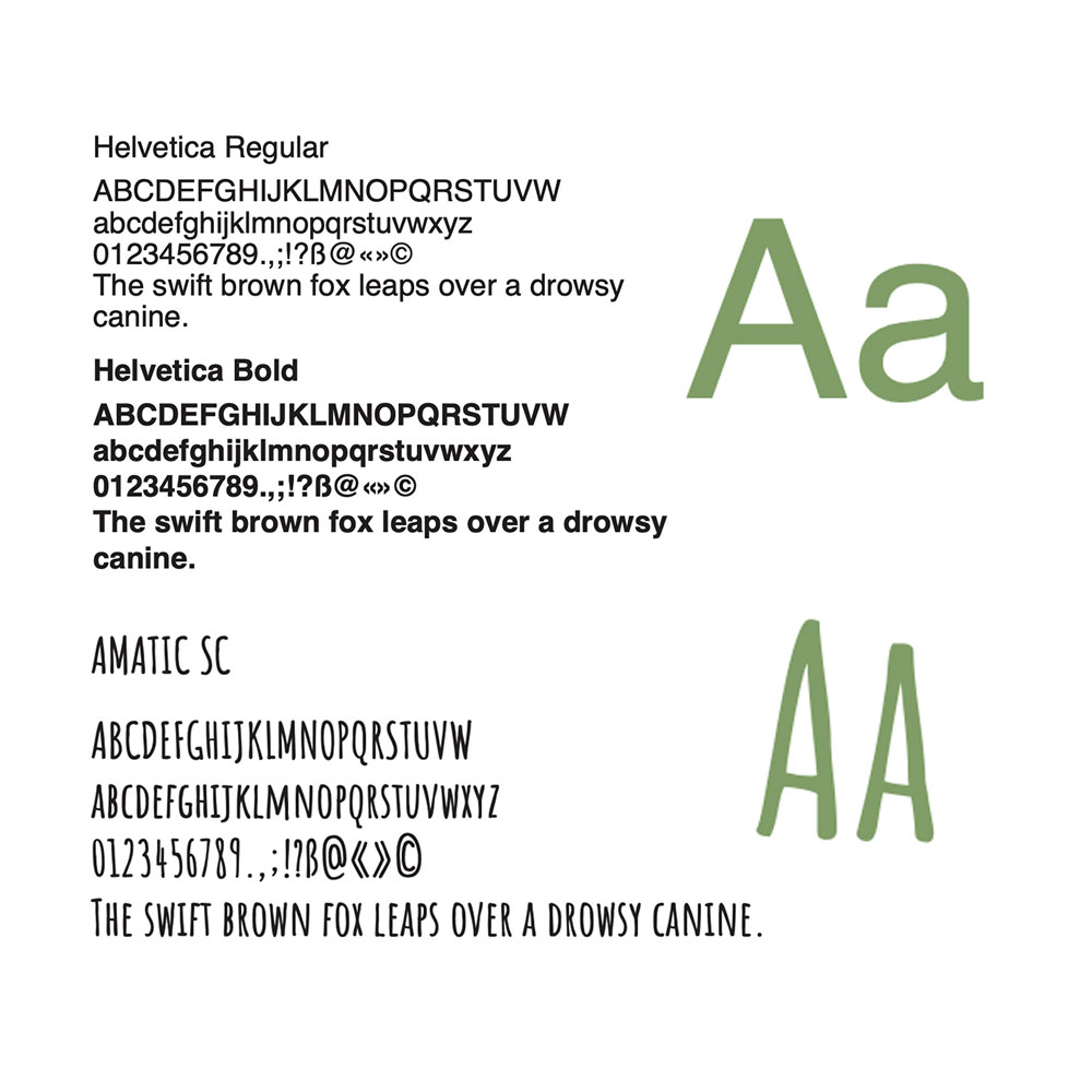 The identity uses two fonts. Helvetica is used for body text, headlines and layout structure. Amatic SC is used in the logo and for individual elements like short lines or highlights. The contrast between the two supports clarity without making the design feel too strict.